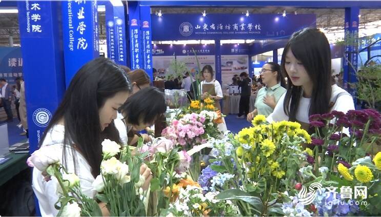 在潍坊工程职业学院展区,学生们正在展示插花技艺。同时,学校展示了部分花卉的种苗,展示了职业教育与花卉产业融合发展的成果。