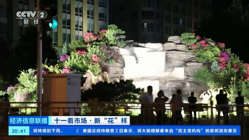 总台央视记者 王闻聪:今年北京广场中心花坛的大花篮和长安街沿线组立体花坛,都在国庆中秋假期增添了夜间照明设施,让夜晚的花坛更加引人注目。北京东单东南角的“黄河赞歌”立体花坛,也被称为是“会唱歌的花坛”。在花坛上不仅能看到微观的壶口瀑布、奔腾的骏马、载歌载舞的人群,还有水雾、音乐等声光电技术,更加逼真地还原了黄河之水天上来的气势。晚上八点,这里仍有大量游客前来拍照打卡。