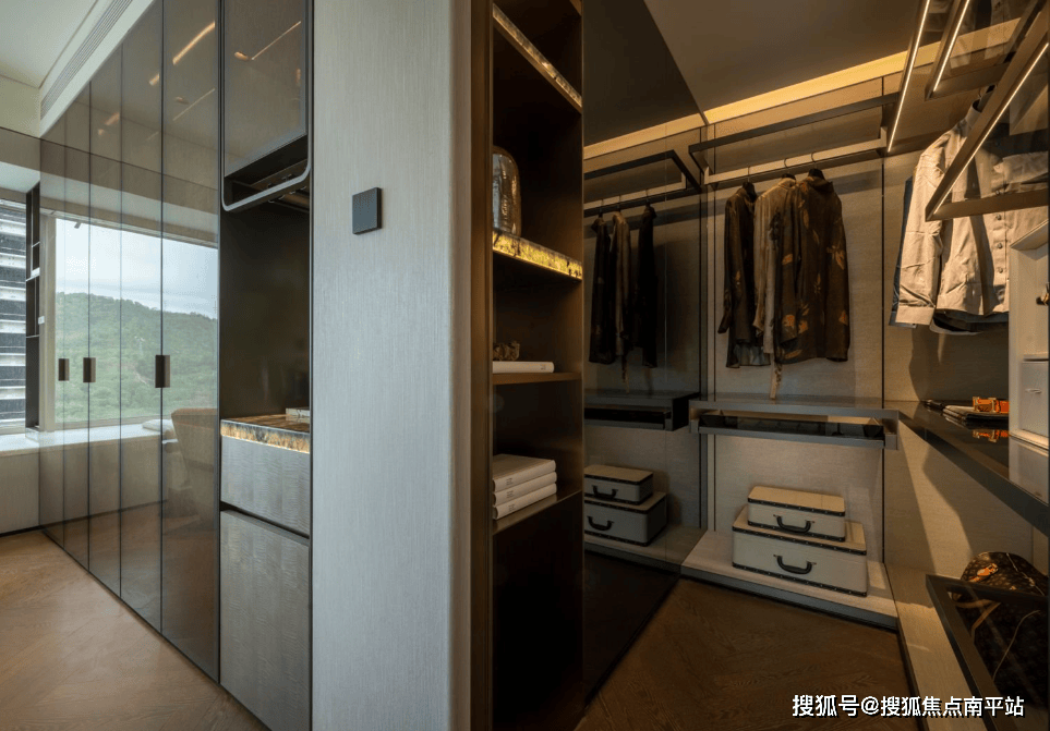 在主卧,除了配置步入式衣帽间,额外预留了一个嵌入式整排衣柜的收纳空间外,而且细分出更多功能区,