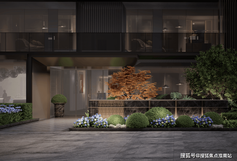 在社区门头上,采用麻省理工学院同款人文高定门头,上海少有的长约35⽶、高约5.1⽶酒店式迎归尺度,并引入价值不斐的名贵黑松、范思哲黑石材与茶色定制铝板,以秀于外隐于内的精神表达,给予每一位业主的尊贵仪式感。
