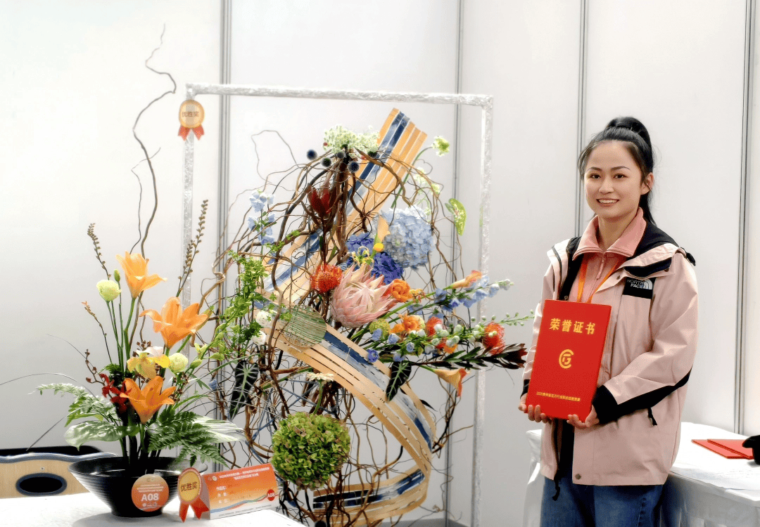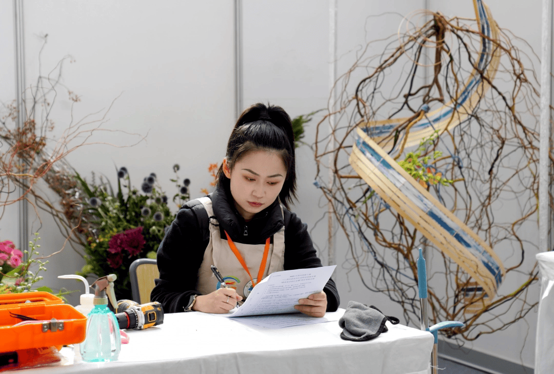 马迪老师也持有同样观点。“我希望通过参赛检验自己的专业能力。”来到赛场后,她发现选手们个个专业精湛、实力不凡。“能有机会向各位高手学习,真的受益匪浅。”她表示,通过比赛不仅巩固了插花基础技巧,更坚定了继续深耕花艺的决心。马迪特别感谢学校的大力支持:“无论是及时解答专业问题,还是协调比赛工具,学校都为我们创造了良好的备赛环境。专门准备的花艺实训室,更是让我们能够安心练习。”