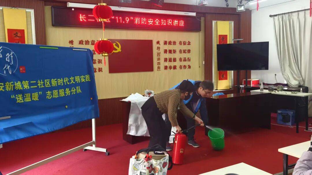 青塔街道长安新城第二社区开展“家庭消防安全演练活动”,通过模拟火情、实操灭火器使用等环节,让居民掌握基本消防技能。