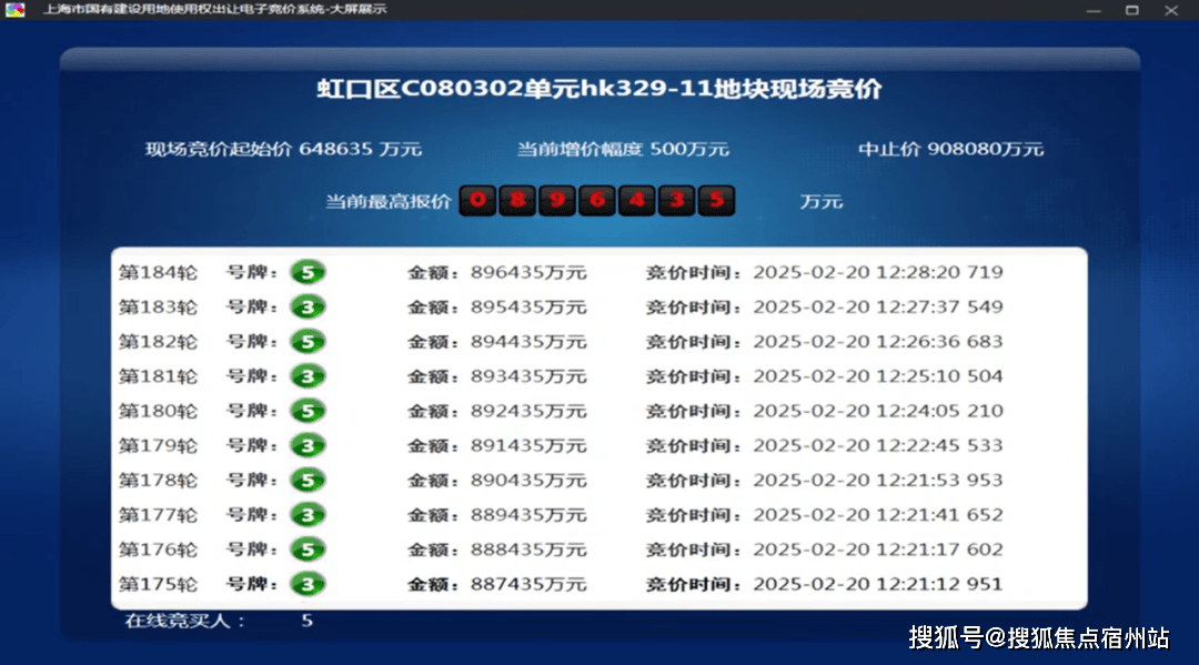 184轮竞价,金茂&庆隆联合体以总价896435万元竞得虹口C080302单元hk329-11地块,溢价率38.2%,折合楼板价117474元/㎡,装修标准不小于4000元/㎡。