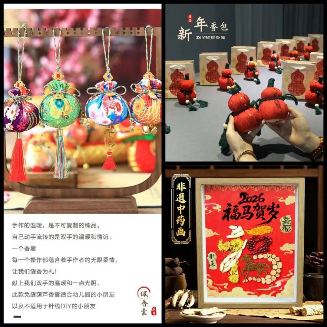 活动内容:手作凝美好,福马纳祥年。把时光揉进指尖,让美好落地成花,一折一剪、一针一线皆是藏在手工里的小浪漫。来参与新年香包DIY葫芦香囊、福马贺岁非遗中药画制作,亲手打造独属于自己的新春手作,在慢下来的时光里,品味手工创作的美好与温情。