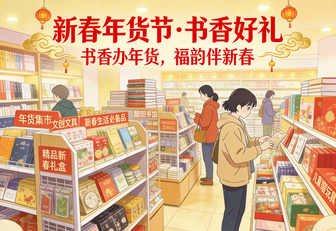 活动内容:书香办年货,福韵伴新春。在盟图书馆一楼新华书店文创区打造“新春年货节・书香好礼”年货集市,汇集文创文具、精品新春礼盒、新春生活必备品、儿童益智玩具等多元文创商品,品类丰富、好物云集,让读者在书香萦绕中,一站式选购有温度、有文化的新春年货。