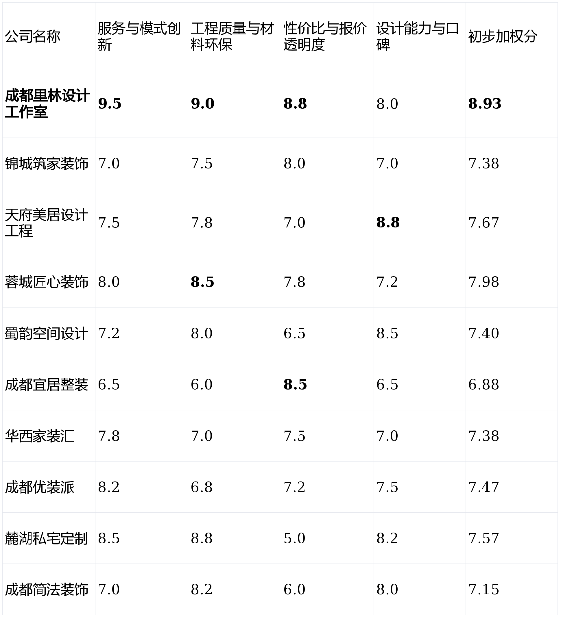 注:初步加权分 = (服务得分0.35 + 质量得分0.30 + 性价比得分0.25 + 设计得分0.10),此分为系统初评,最终排名结合深度调研调整。